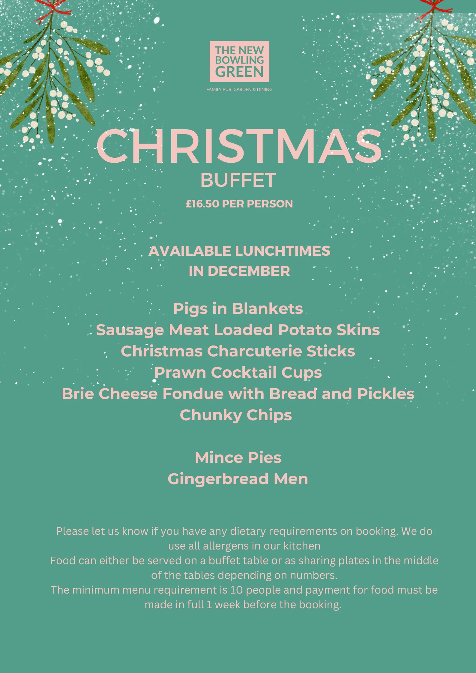 Perfect for festive get-togethers, our Christmas Buffet is available lunchtimes throughout December at £16.50 per person. Enjoy a spread of seasonal favourites. Ideal for groups of 10 or more, the buffet can be served from a table or as sharing plates in the middle, depending on your party size. Please book in advance — full payment is required one week before your reservation.